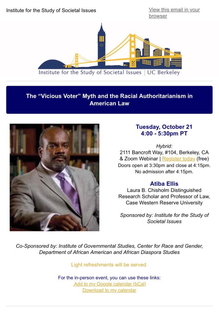 Excited to give this talk tomorrow for the Institute for the Study of Societsl Issues at the University of California – Berkeley. Stop by if you’re in the area or join via zoom: http://bit.ly/AtibaEllis